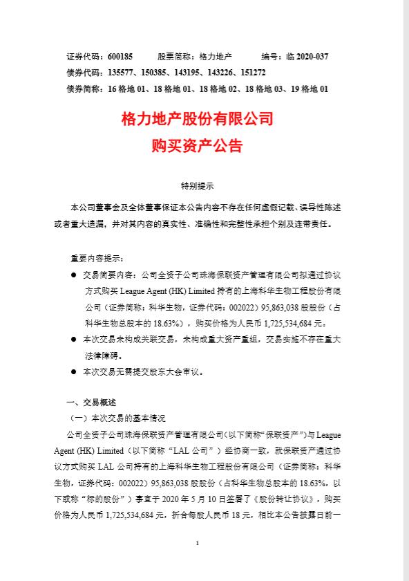 实际上,这已经是近日来格力地产的第二次跨界收购,5月10日晚间,格力地产发布公告,公司全资子公司珠海保联资产管理有限公司(简称珠海保联)拟通过协议方式购买LeagueAgent(HK)Limited(简称LAL公司)持有的上海科华生物工程股份有限公司(002022.SZ)9586万股股份,占科华生物总股本的18.63%,购买总价为17.26亿元。